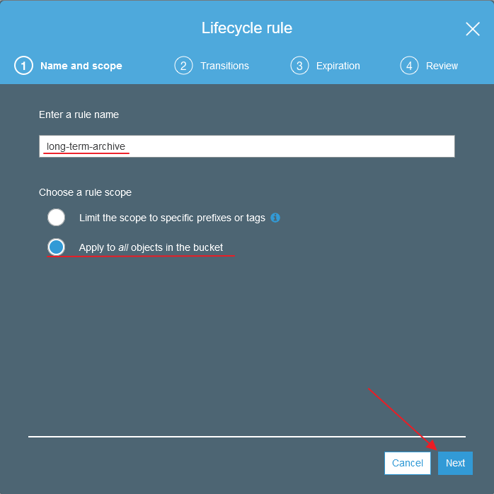 We need to give our new rule a name and decide if we want this to apply to all objects in the bucket or only ones with specific prefixes or tags. For this example we'll just do all the objects in the bucket.