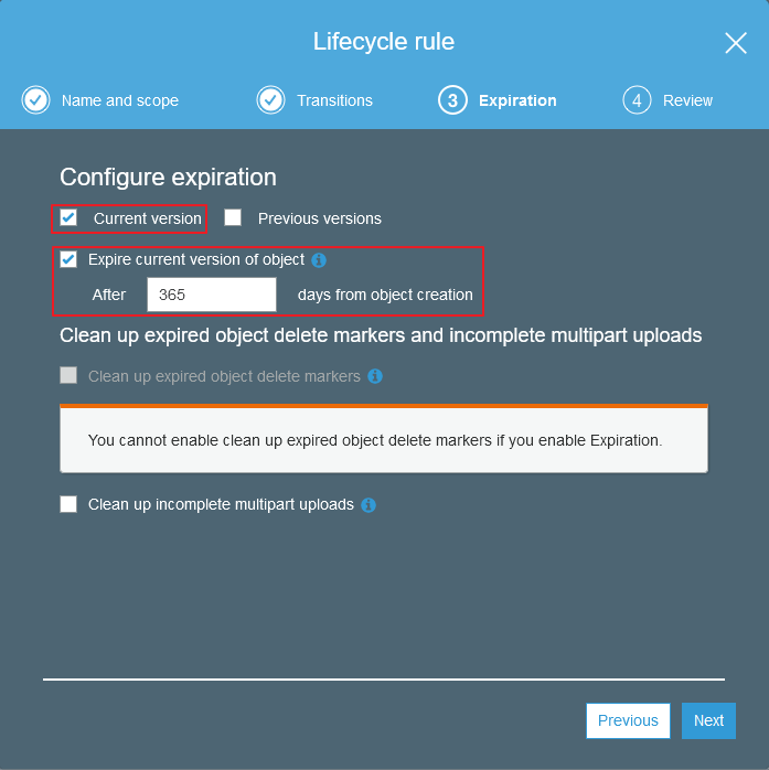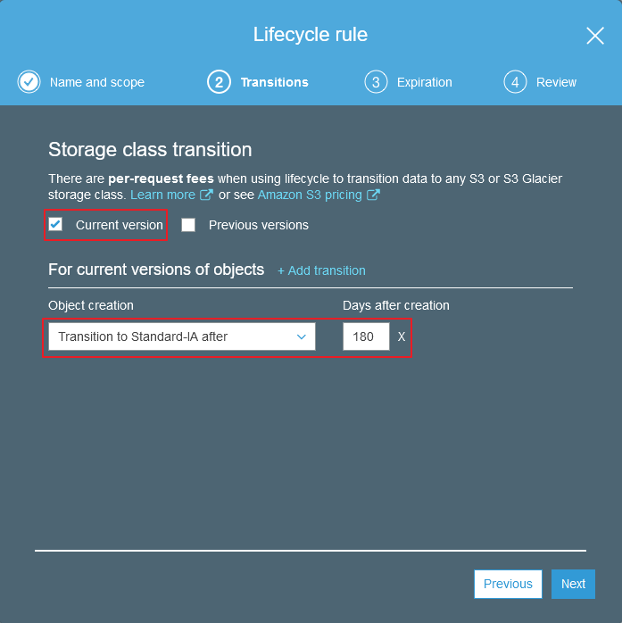 If you are using bucket versioning you can decide if you would like to transition all previous versions of the object, only the current version, or all when this rule is applied. Since we are not using versioning we'll just check current.