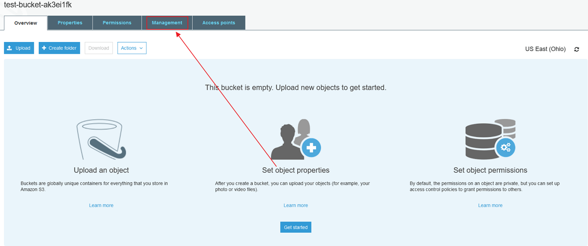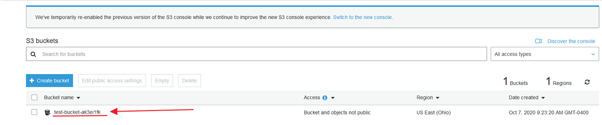 For this example we are going to create a basic bucket in S3 with the default settings and then click on the link to open it.